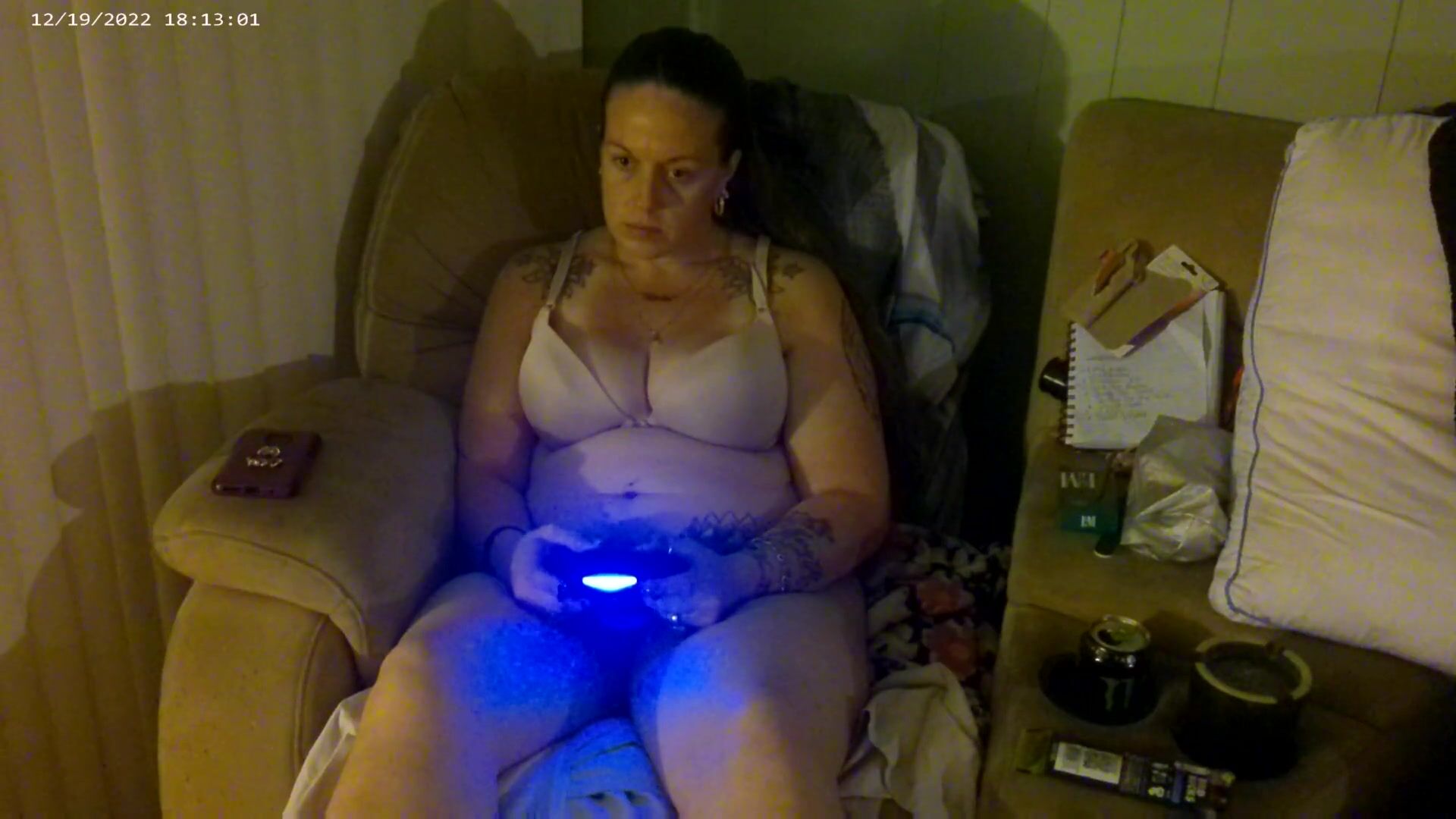 BREASTY LENGTHY HAIR BRUNETTE HAIR IN BRASSIERE AND PANTS PLAYING PLAYSTATION