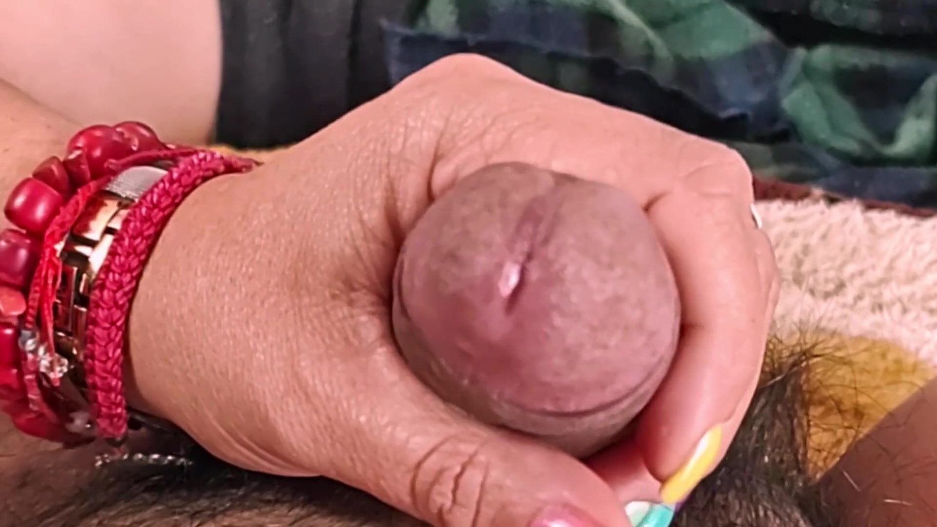 SHE MASTURBATES ME AND MY PENIS GETS WET WITH DROPLETS OF PLEASURE.